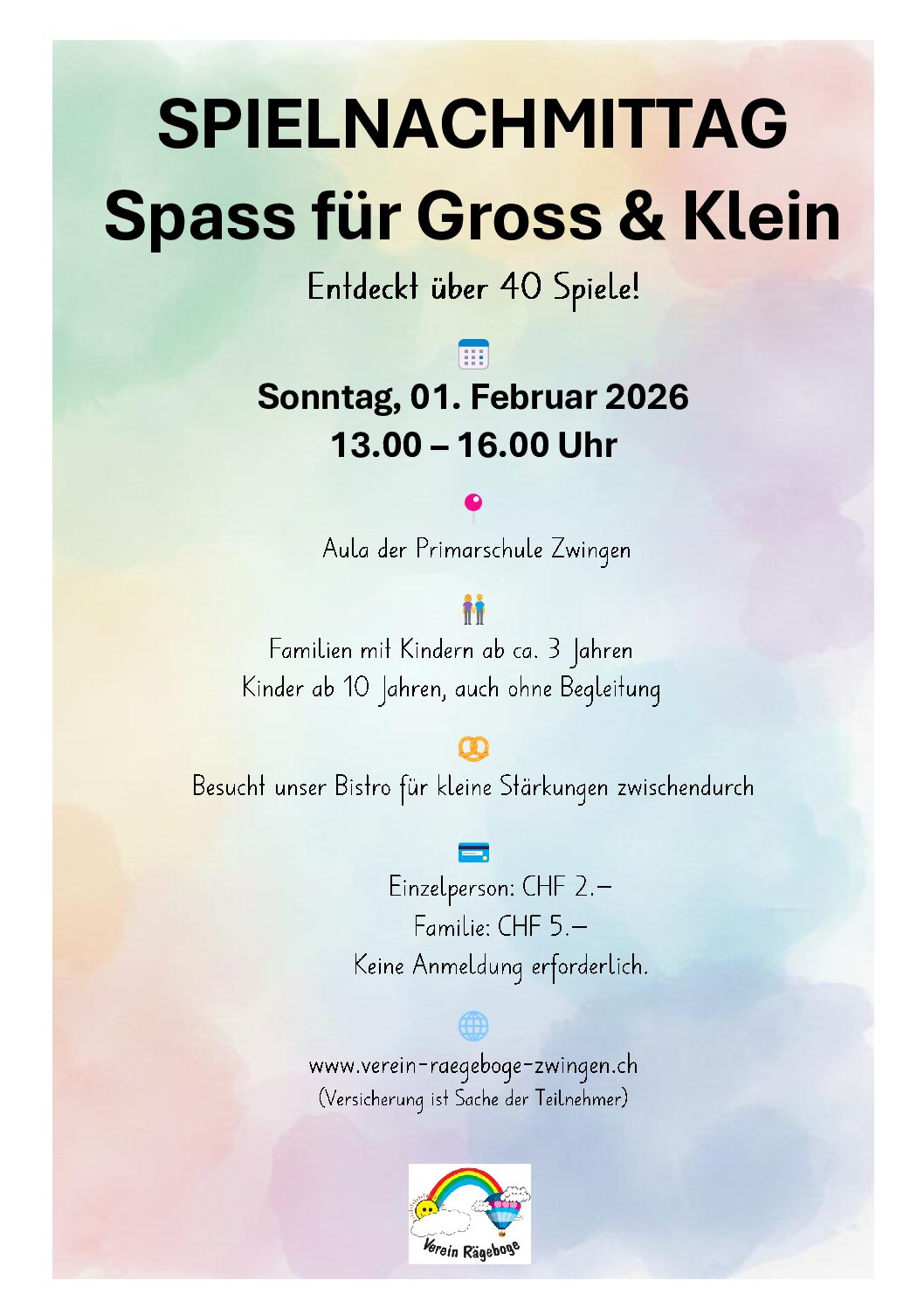 - Ort: Der Spielnachmittag findet im Gemeindesaal (Primarschule Zwingen) statt